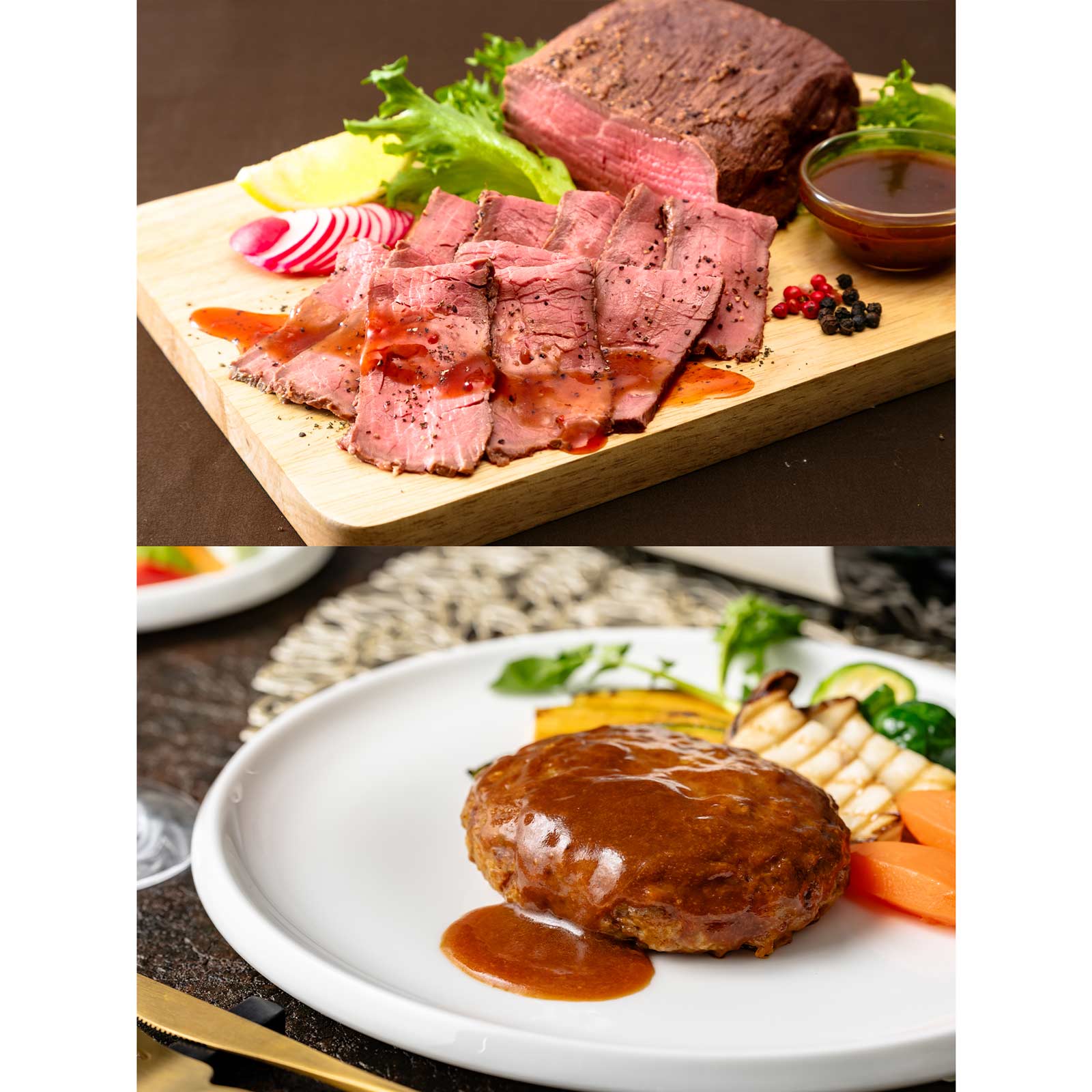 特製スパイスで味付けしたこだわりのローストビーフとデミグラスソースハンバーグ