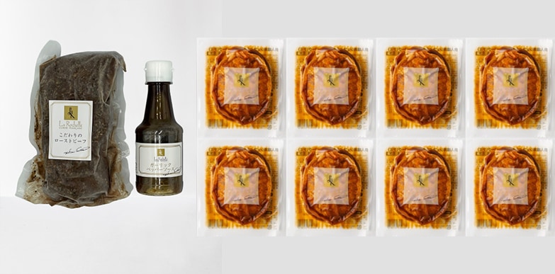 | 内容量 | ●ローストビーフ350g×1 ●特製ガーリックペッパーソース120ml ●デミグラスソースハンバーグ155g×8 |